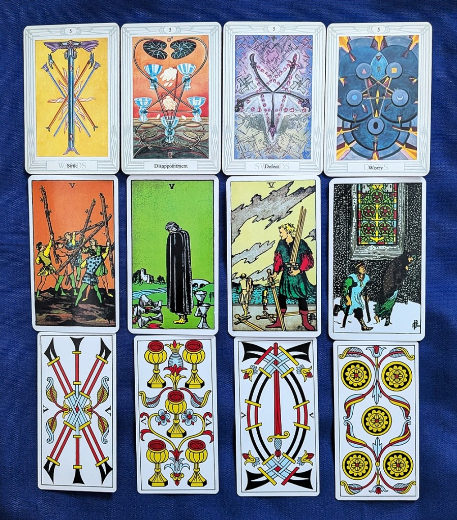 It will be instructive to perform a visual and verbal comparison of the Fives from the three major decks in use today: the Thoth, the Waite-Smith and the Tarot de Marseille:
