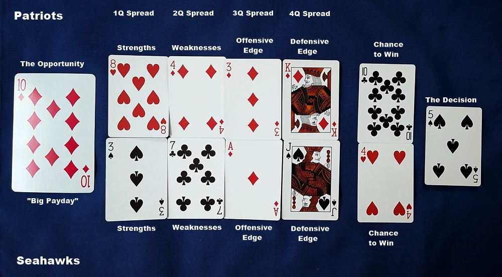 This year, the AFC Patriots have received “home team” status (although neither one is “at home” in Santa Clara, CA), so I’ve placed them in the top row of the layout with the Seahawks below. When doing this reading with the tarot, I always use the Chariot to represent “triumph” as the Opportunity card, but there is no equivalent card in a playing-card deck so I chose the 10 of Diamonds to stand for a “big payday” full of rewards and recognition.