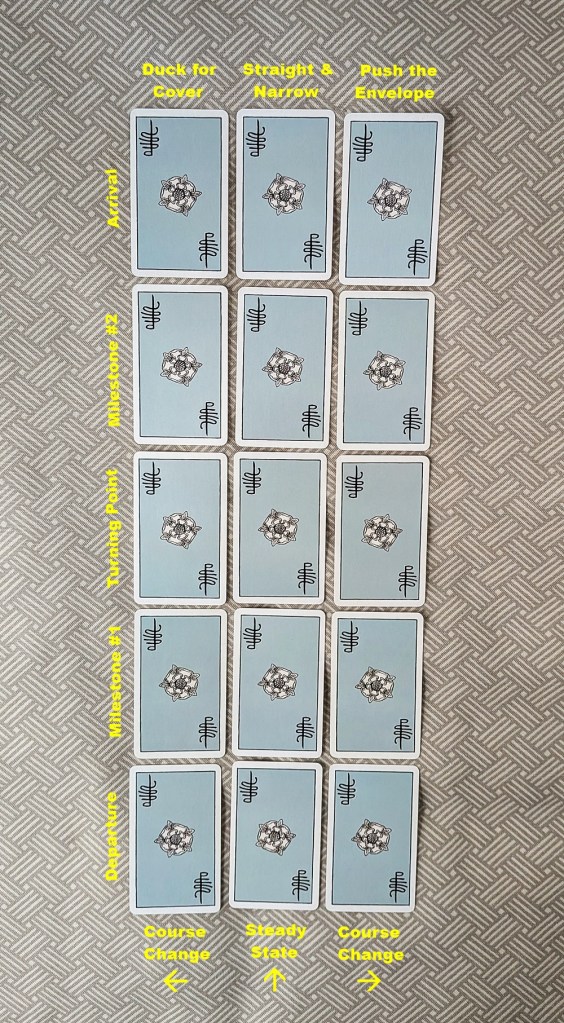 Departures from the steady-state advancement shown by the middle column are indicated by the “facing” of the human figures or other “pointers” on the cards. When they are left-facing, the action will resume with the next card above in the left-hand column, while if facing right, the next ascending card in the right-hand column will be activated. If they are facing straight out of or into the scene, or if there are no directional indicators on the card, the upward path will stay on its present course. The flow of events and circumstances will also move straight up if a card is adjacent to the outside edge of the layout with no card in the “facing” direction. (Reversal will reorient the focus accordingly.)