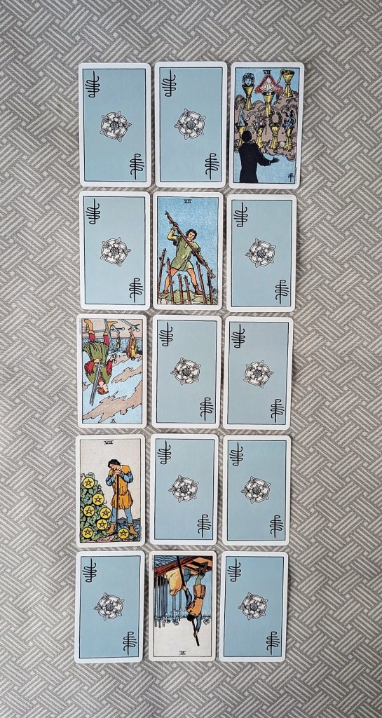 For ease of interpretation, remove the five selected cards from the spread and place them from left-to-right in the three-tiered array shown in the bottom image.