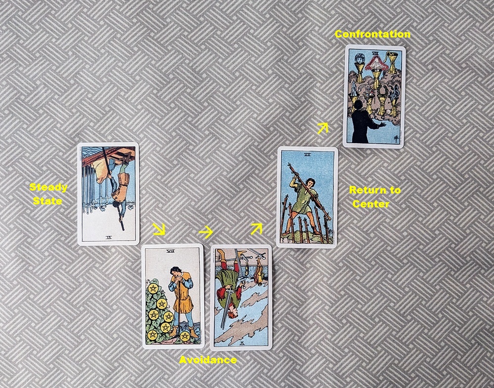 Here is an example spread that looks at how a particular situation is likely to unfold. After its inception with the reversed 6 of Swords looking for an escape route, the matter moves into “avoidance” mode (7 of Pentacles and 5 of Swords reversed) where the situation is less-than-satisfactory, then re-centers itself (7 of Wands) to retaliate and ends in a state of confused confrontation (7 of Cups). The two reversed Air cards bracketing the hostile Earth card suggest a mental quandary that exacerbates the frustration of “unfulfilled success” and provokes a strong reaction that ultimately fizzles.