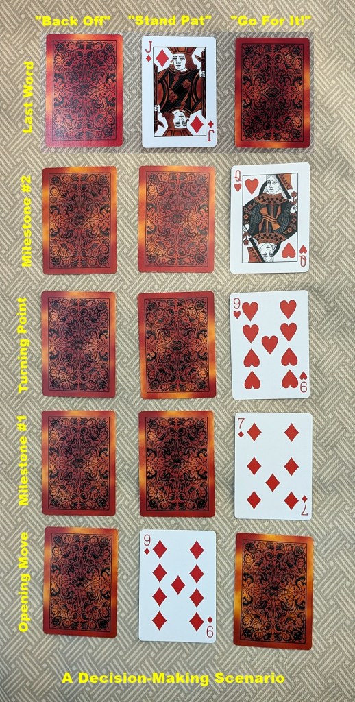 Here is an example “decision-making” spread using my recently-posted “Detours and Dead-Ends” Mid-Course Correction layout. It begins with the bottom-middle position of a face-down 15-card array and proceeds upward from there. There were no black cards in the reading to reverse the rightward flow and only the gaze of the Queen of Hearts near the top to shift it back toward the center. Therefore, it pegged out in the “Go For It!” column, with the advice to “Just do it, you won’t regret it.” Once maximum benefit has been realized, the Jack of Diamonds settles back into the “comfort zone.” The individual cards will fill in the details, but the overall impression is that this could be a promotional flyer for the “Make-A-Wish” foundation.Alternatively, it could be telling the Jack of Diamonds to “take the money and run.”