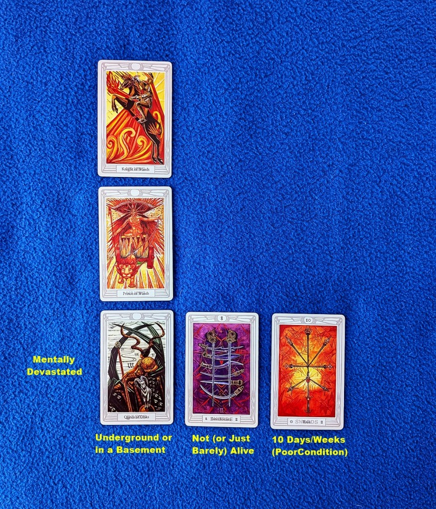 The 8 of Swords (“Interference”) is one of the emphatic “No” cards, so it could be speculated that she is no longer alive, but on the off-chance that she is, she may not be long for this world due to the harsh conditions she is encountering in captivity or the consequences of the stalled ransom scenario.