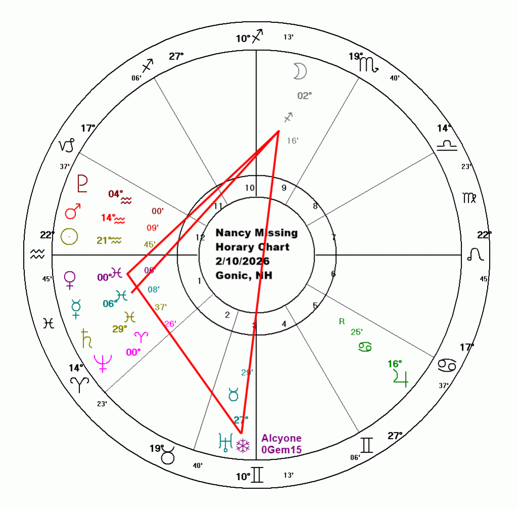 This was a challenging chart to analyze because of the overwhelming 1st House emphasis and the presence of the Lord of the 4th centrally located there. Unless Nancy has been cleverly hidden in the immediate vicinity of her home or her daughter’s residence, the Moon in Sagittarius in the 9th House suggests that she has been transported farther afield, most likely to the South-Southwest. I can’t claim that any of this is sound horary astrology technique since it amounted to “clutching at straws” (kind of like the predicament of law enforcement in this case). The most compelling thing is the active engagement of Alcyone with the Moon, Venus and the Part of Fortune, although it is slightly out-of-orb with the square to Mercury.