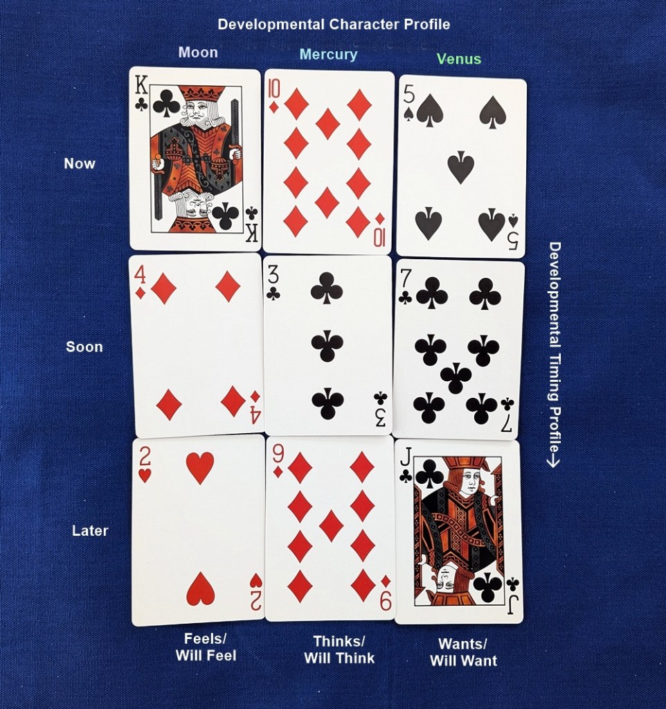 Except for the “Later” outlook, the Developmental Character Profile seems to go downhill across all parameters and time frames. Perhaps mental and emotional conviction will falter in the face of challenges to the individual’s sense of personal values (the realm of Venus). Only the long-term forecast settles out in reasonably good shape with the Jack of Clubs. But I suppose that conclusion is all most querents will want to hear; everything else is incidental to a happy ending.