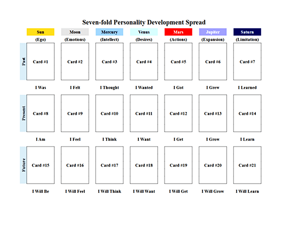 AUTHOR’S NOTE: Several years ago I adapted the 21-card Romany spread for use with the seven planets of classical astrology and came up with a dual-axis developmental profile for both character analysis and associated timing. All seven columns can be used for a complete personality study, or only those that apply to specific circumstances can be addressed as I did in the example reading below.