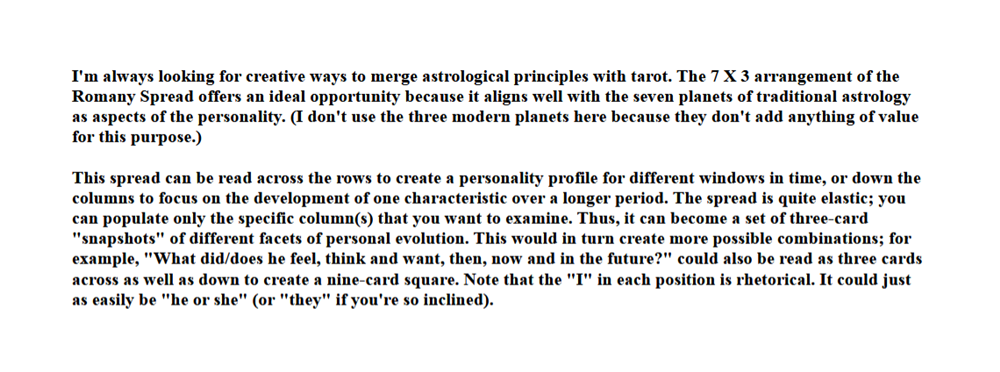 Although it was developed for tarot, it is equally effective for other types of cartomancy. Since I created it, I decided that the past isn’t really relevant in this kind of reading, which is more about “being and becoming,” so I recently altered the model to look only at the present, the near future and the longer-range status. At some point I will re-do the graphic.