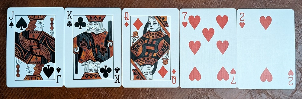 Overview: The three adjacent face cards seemed to have the potential for lively interaction, but beyond the King of Clubs exchanging a few amiable words with the Jack of Spades (a total stranger) at a gas station, there was no excitement forthcoming. The two mild-mannered Hearts at the end had me paraphrasing T.S. Eliot: “That’s the way the trip ends, not with a bang but a whimper,” or rather a sigh of relief.