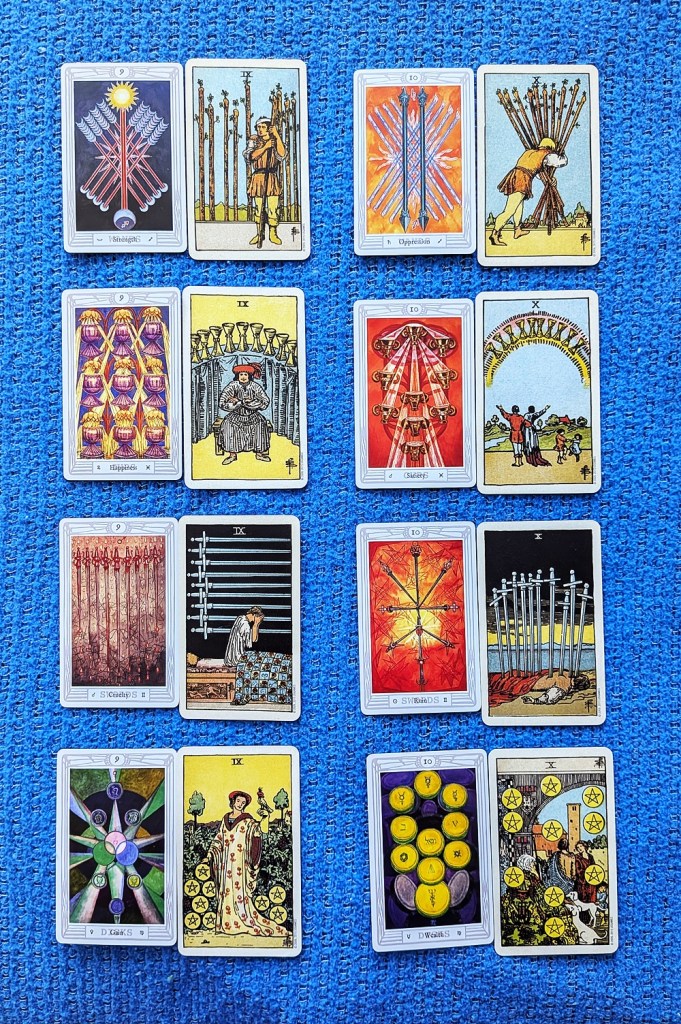 In the annals of esoteric tarot literature, Crowley made the most lucid attempt to keep all of this in perspective when describing the nature of the forty Minor Arcana in The Book of Thoth, while the Golden Dawn’s system of “lordships” occasionally dipped into Pythagoreanism. For example, Crowley’s title for the 10 of Cups was “Satiety,” implying an excess of pleasure that carries the risk of overindulgence, while in the Golden Dawn’s Liber T tarot curriculum it was named “Lord of Perfected Success.” It’s easy to see that Crowley was more attuned to the Qabalistic vibe in this case as in many others. It will be instructive to undertake a visual comparison of the Nines and Tens from the Thoth and Waite-Smith decks to see where the emphasis lies between the Hermetic and Pythagorean worldviews. (Except for the Thoth titles in quotation marks, the definitions are mine.)
