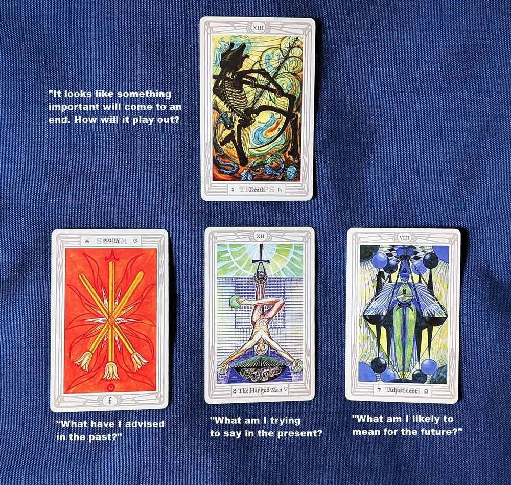 Ricklef recommends not assigning predefined position descriptions to the spread used for this reading (e.g. no “past-present-future” format), and just reading the layout as a narrative. But if we’re going to hand the subject card a metaphorical microphone and a “bully pulpit” to state its own case, I think it behooves us to provide at least a rudimentary outline for the presentation. In a three-card line, the rhetorical discourse might begin at the left with “What have I advised in the past?” It would continue with “What am I trying to say in the present?” The right-hand card would convey “What am I likely to mean for the future?” (Ricklef notes that other spread designs can be used but the three-card draw seems adequate for the purpose, and I concur.)