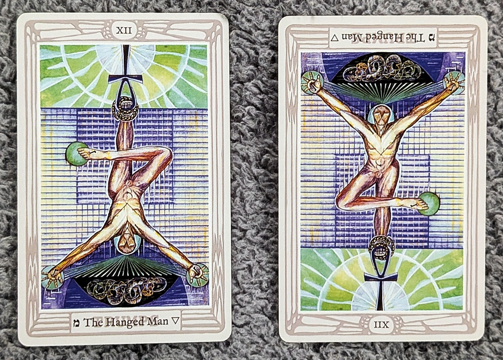 The Waite-Smith card does not partake of this symbolism because the legs of the victim are facing in the opposite direction, making it a mirror-image of the Thoth rendering. But when reversed the RWS scene shows the previously suspended figure being irresistibly lifted by the halo around his head (while he seems to be dancing a jig), which accomplishes the same thing. Not unlike the often-misjudged Tower, there is an epiphany about the experience of liberation from bondage, here offered by reversal, that should not be overlooked.