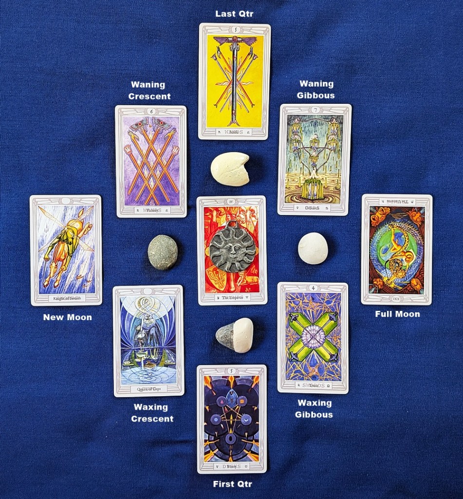 AUTHOR’S NOTE: I haven’t done one of these in quite a while. These readings are normally based on the titles for the eight lunar sub-phases from astrologer Dane Rudhyar’s Lunation Cycle, but this time I’m using astronomical notation. Each sub-phase lasts approximately 3.5 days. There are no other position meanings, it is mainly a timing device for events and circumstances as indicated by the cards.